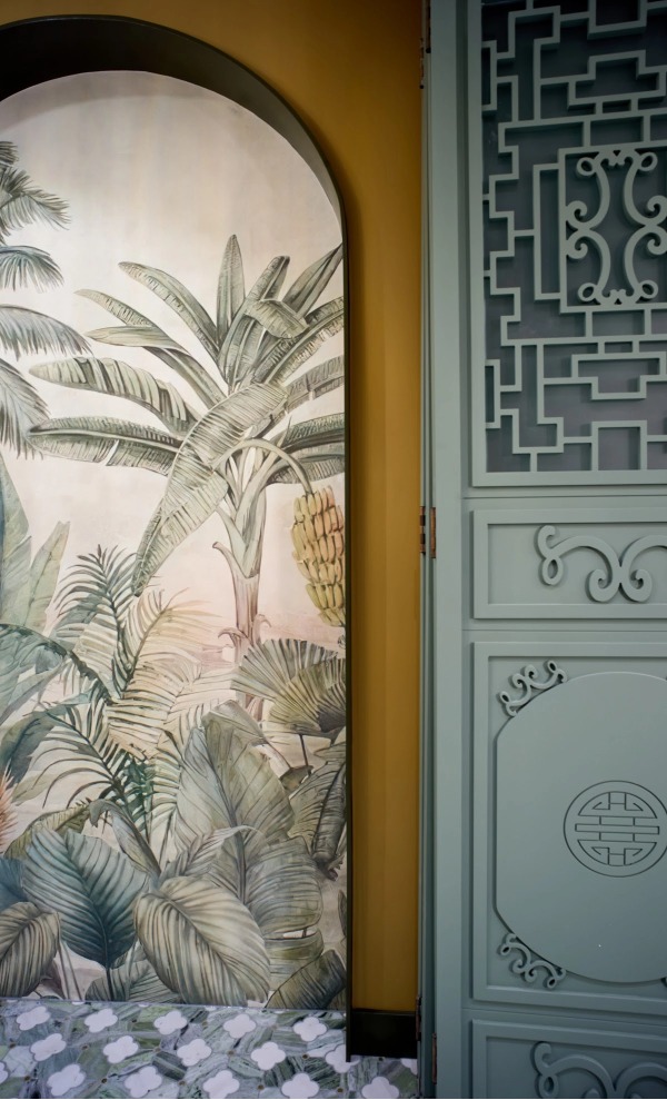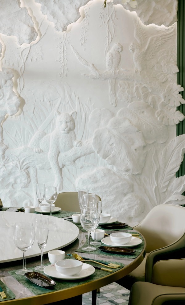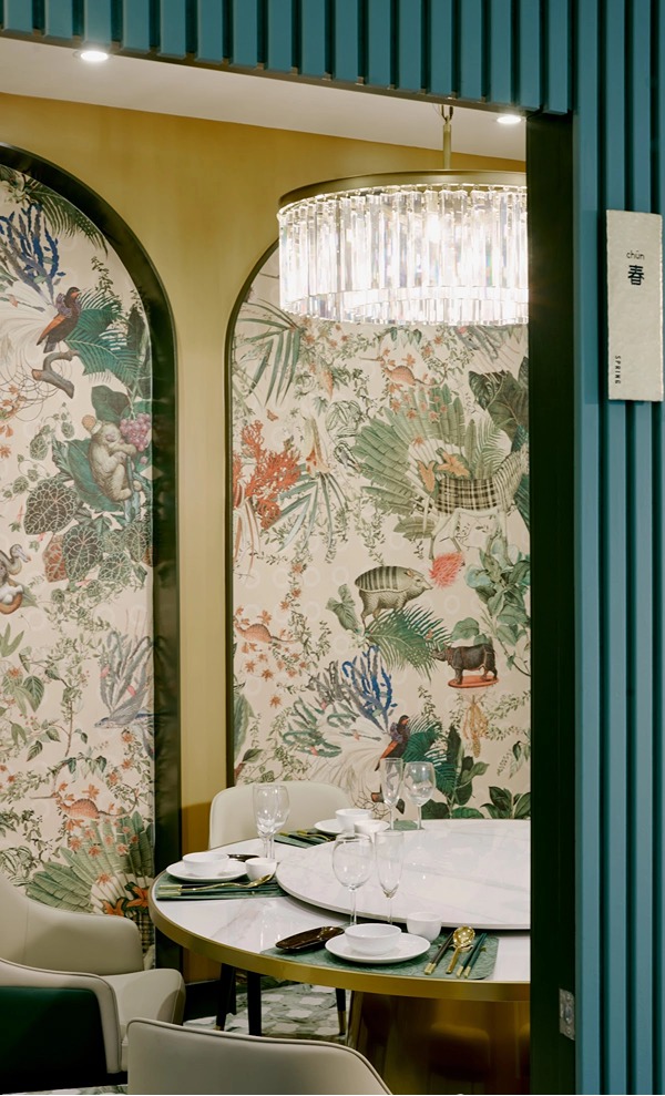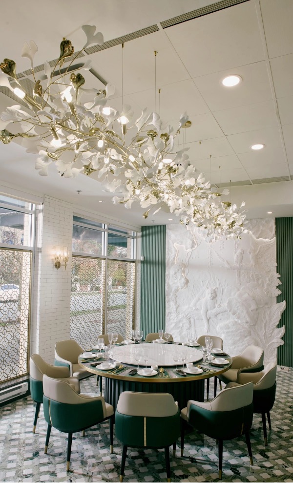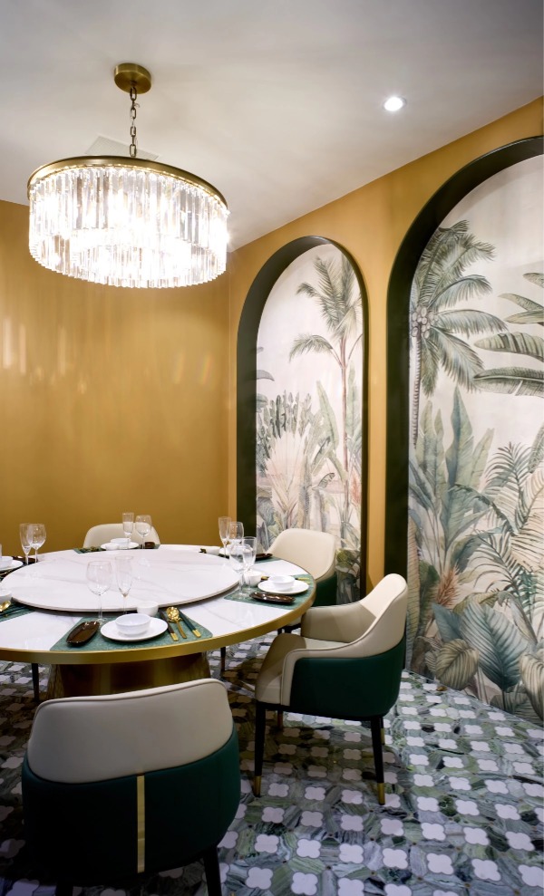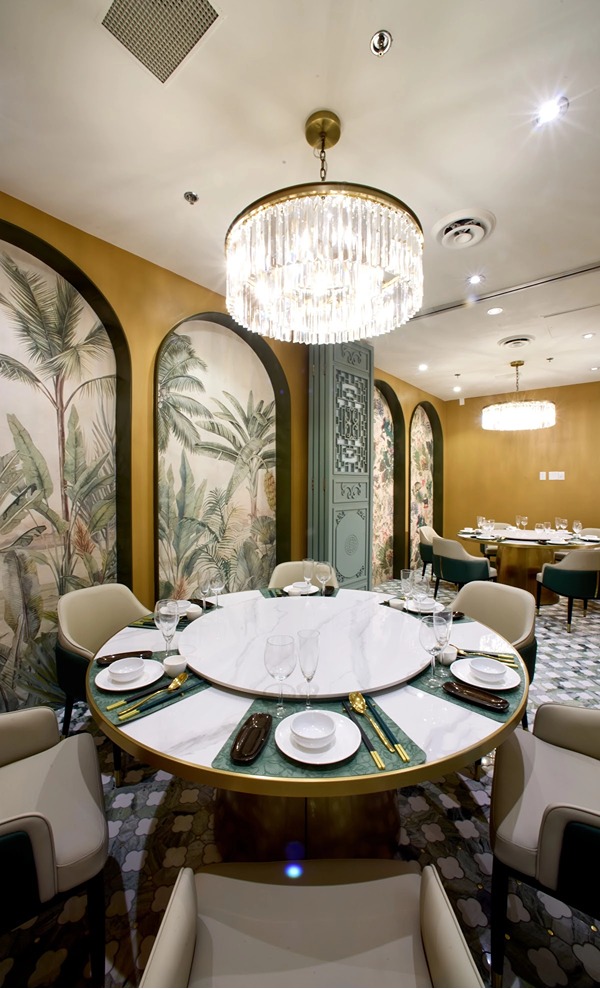 Elegant, modern dining space awash in a serene green and gold color palette, featuring refined décor, mosaic flooring, decorative window screens, and several private VIP rooms for intimate gatherings