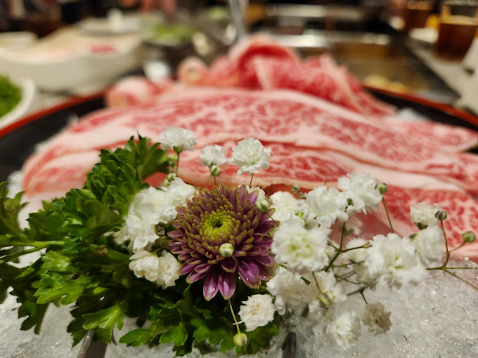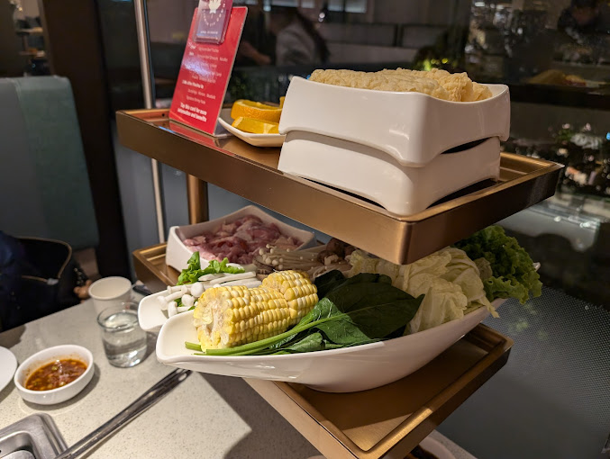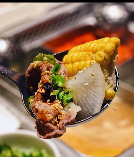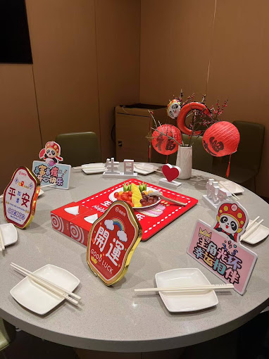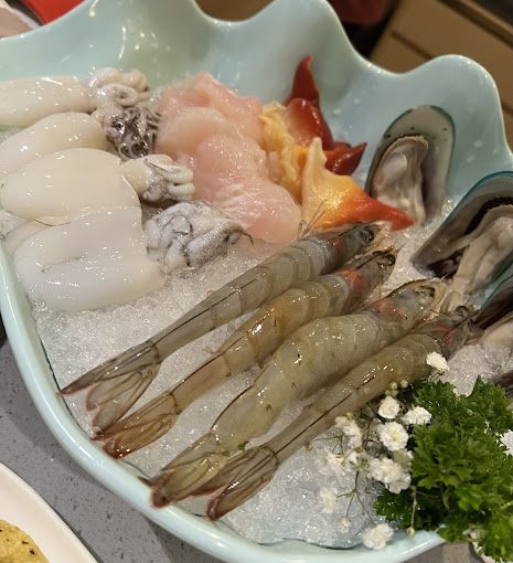 Stepping in you’ll see a spacious, modern hot pot hall with decorative lanterns or ambient lighting, polished wood & marble touches, private booths and large round tables for groups, open ingredient displays, lively staff, soothing music, and abundant natural & warm light by large windows. The aroma of simmering broths and sizzling condiments fills the air—energizing yet welcoming