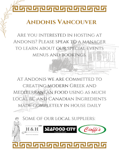 Andonis is a Greek-inspired supper club at 1193 Granville Street in Vancouver that blends upscale Mediterranean cuisine with vibrant nightlife. They serve dinner from around 5 PM, then from late evening throw a nightclub-style atmosphere with entertainment, cocktails, and a party energy that lasts until the early hours.eGift Card Offers