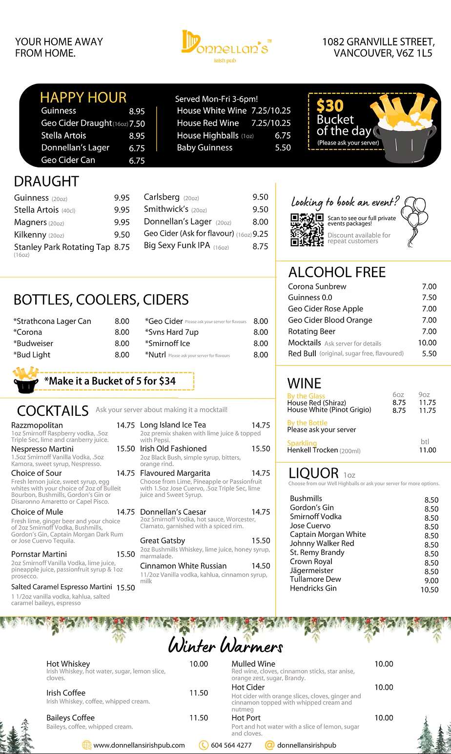 - Donnellan’s Irish Pub is located at 1082 Granville St in Vancouver. It’s an authentic Irish-style pub offering hearty comfort food such as Irish stew and fish & chips, proper pints of Guinness on tap, and live music and DJ sets on weekends.