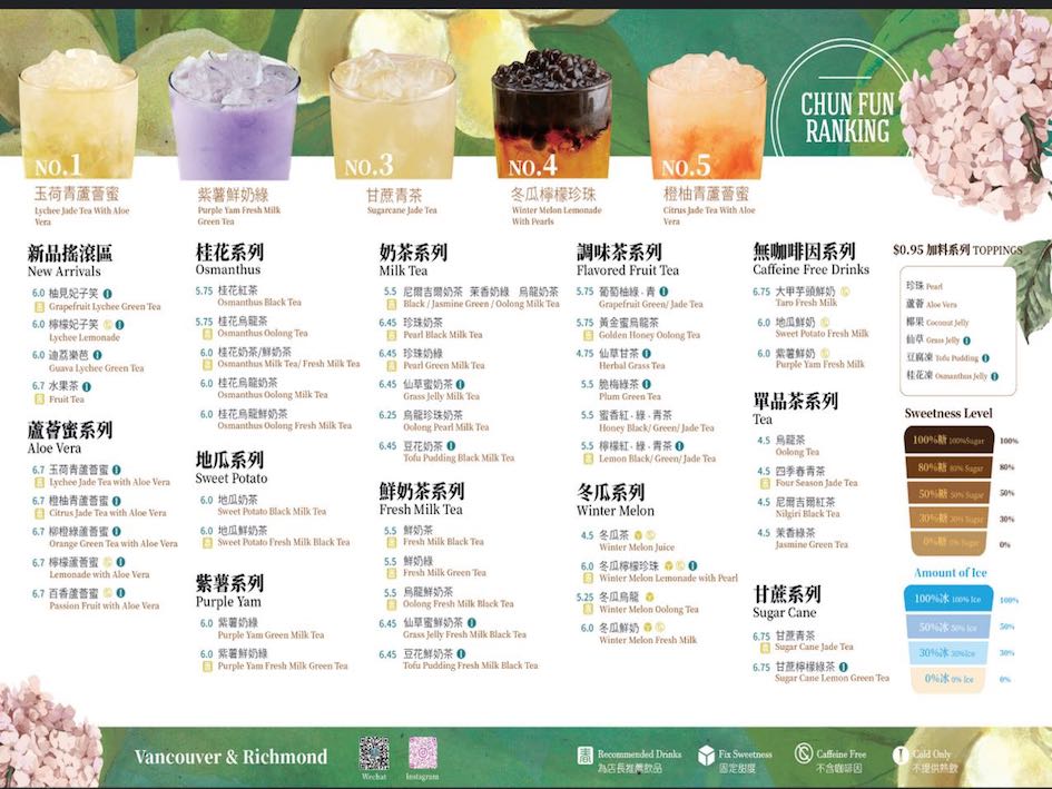 CHUN FUN HOW is a Taiwanese bubble tea chain with a location on Broadway (1067 W Broadway, Vancouver). They specialize in exquisitely crafted bubble teas, fruit teas, creative drink blends (e.g. Lychee Jade Tea with Aloe, Purple Yam Fresh Milk), and desserts like cheese tarts. Their signature cups with floral designs are popular with fans, and it’s a favored spot for both tea lovers and social media snapshots.