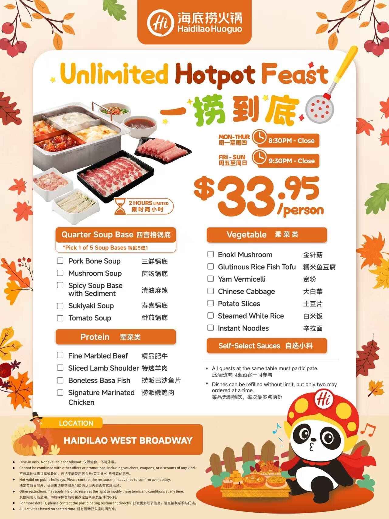 Haidilao Hot Pot offers an immersive dining experience with customizable soup bases, premium ingredients, and exceptional service. Signature dishes include the Malatang Combo (Tomato or Spicy Broth), Pork Stomach and Chicken Soup, and Spicy Beef Butter Soup Base. Guests can enjoy interactive elements like hand-pulled noodle performances and a self-serve sauce bar, making it a top choice for hot pot enthusiasts.