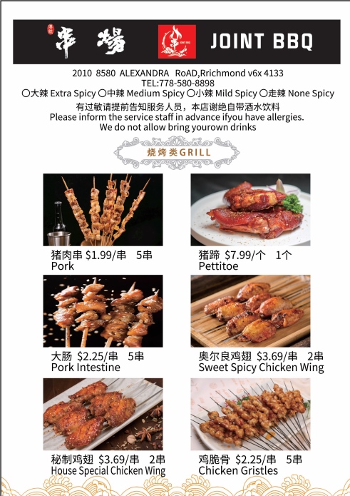 Joint BBQ (串场烧烤) is a lively Chinese skewer restaurant in Richmond, BC, specializing in Northeastern-style charcoal-grilled skewers. The menu features a wide array of meats and offal, including lamb, beef tendon, pork intestine, and chicken gizzards, alongside unique items like goat kidney and grilled squid. Vegetarian options such as tofu rolls and enoki mushrooms are also available. Signature dishes like Guobao Pork and spicy duck heads highlight bold, authentic flavors. With its late-night hours and nostalgic ambiance, Joint BBQ has become a popular spot for those craving traditional Chinese barbecue.