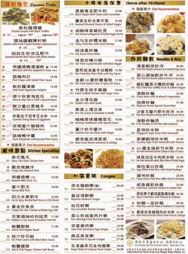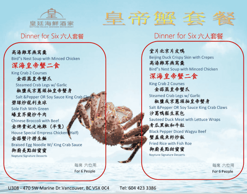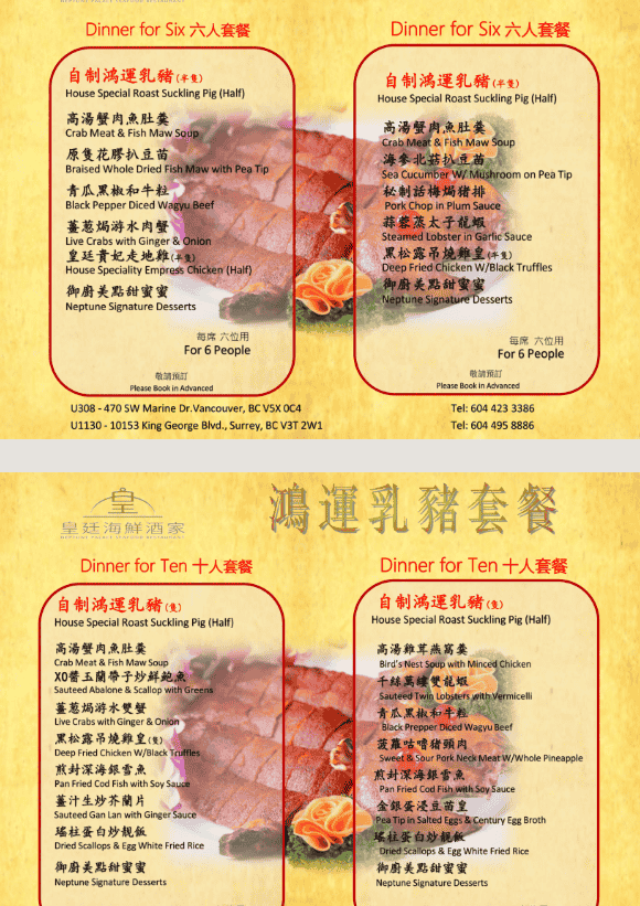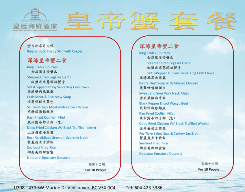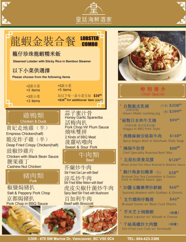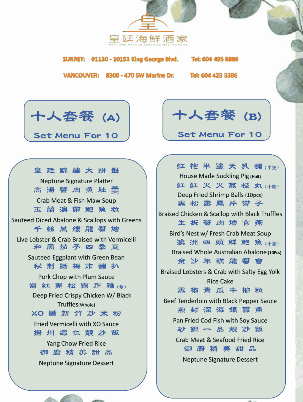 Neptune Palace Seafood Restaurant, part of the renowned Neptune Group, is an upscale Cantonese restaurant celebrated for its refined dim sum and live seafood offerings. The spacious dining room features elegant chandeliers, gold accents, and large round banquet tables perfect for family or business gatherings. Guests can enjoy classic dim sum items during the day — from har gow and siu mai to steamed buns and rice rolls — and indulge in premium seafood dishes at dinner such as steamed grouper, lobster noodles, and typhoon shelter crab. Consistent quality and polished service make it a staple of Vancouver’s Cantonese dining scene.