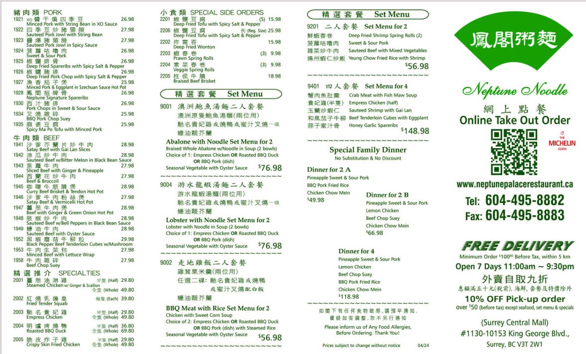 Neptune Wonton Noodle is a well-known Cantonese eatery in Richmond, BC, celebrated for its comforting noodle soups, congee, and dim sum. Signature dishes include fresh shrimp wonton noodles, preserved egg with lean pork congee, and a variety of tossed noodles. The restaurant offers a wide selection of traditional Cantonese fare, making it a popular spot for both quick meals and late-night dining.