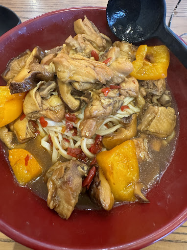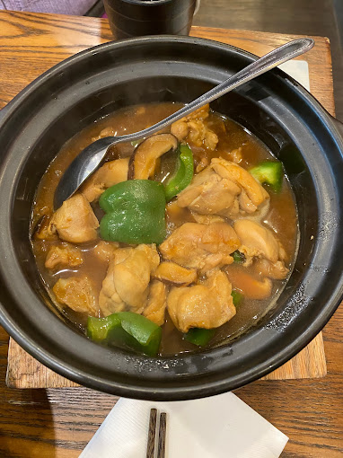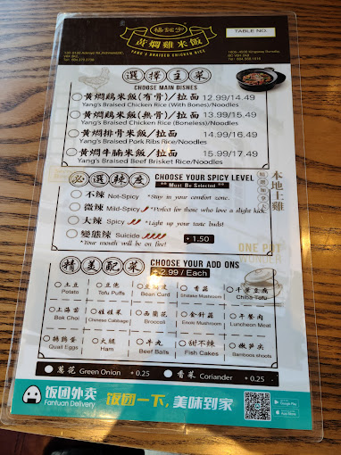 Yang’s Braised Chicken Rice is a fast-casual Chinese eatery specializing in a single signature dish: huang men ji, or braised chicken stew. This Shandong-style comfort food features tender chicken thighs simmered in a savory soy-based sauce with shiitake mushrooms, ginger, and chili peppers, served alongside steamed rice. Diners can customize their spice level—mild, medium, or spicy—making it a satisfying and straightforward option for a quick, flavorful meal.