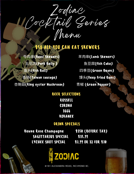 Zodiac Karaoke and Pub KTV (Richmond) is a vibrant late-night destination combining private KTV rooms, bar service, and party dining. Each themed room features sleek neon lighting, premium sound systems, and playful aesthetics ranging from modern minimal to gold-luxe interiors. Perfect for birthdays, group hangouts, or company celebrations, guests can enjoy Asian and Western bar bites, fried platters, skewers, and signature cocktails — a lively hub for Richmond’s nightlife crowd.